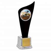 Troféu 401111-PPTME - Troféu com 48 cm de altura, base oitavada em polímero metalizado na cor prata com 14,5 cm de largura, sobre esta base uma placa na cor preta metálica e leito personalizável para adesivo de 106 mm, metalizado na cor prata. Placa para gravação.