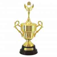 Troféu 700433-DO – Troféu com 54 cm de altura, base redonda com 21 cm de largura em polímero na cor preta. Sobre esta base dois suportes em polímero metalizado na cor dourada intercalada por um anel em polímero metalizado na cor prata. Taça com 33 cm de largura a partir das alças metalizada na cor dourada com tampa em polímero metalizada na cor dourada. Estatueta intercambiável. Plaqueta para gravação.